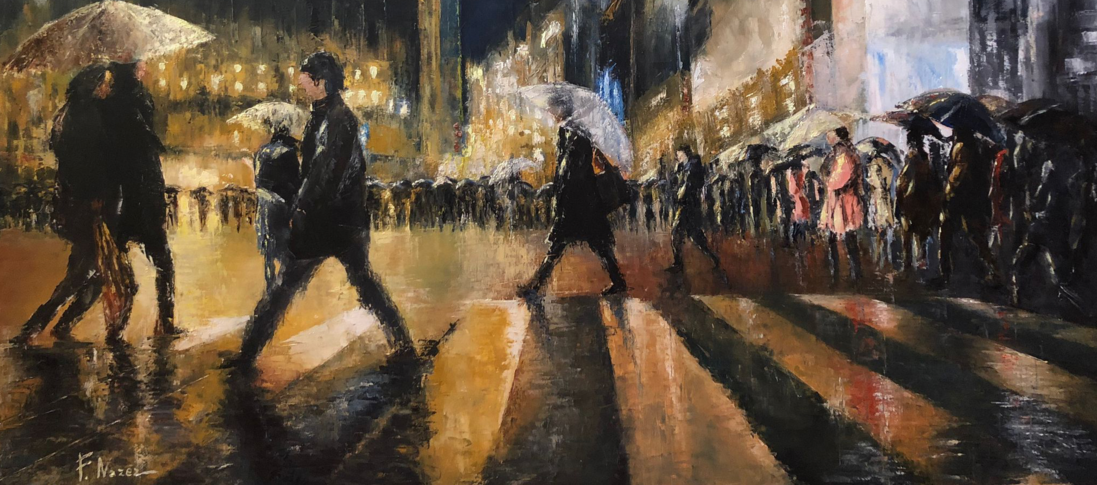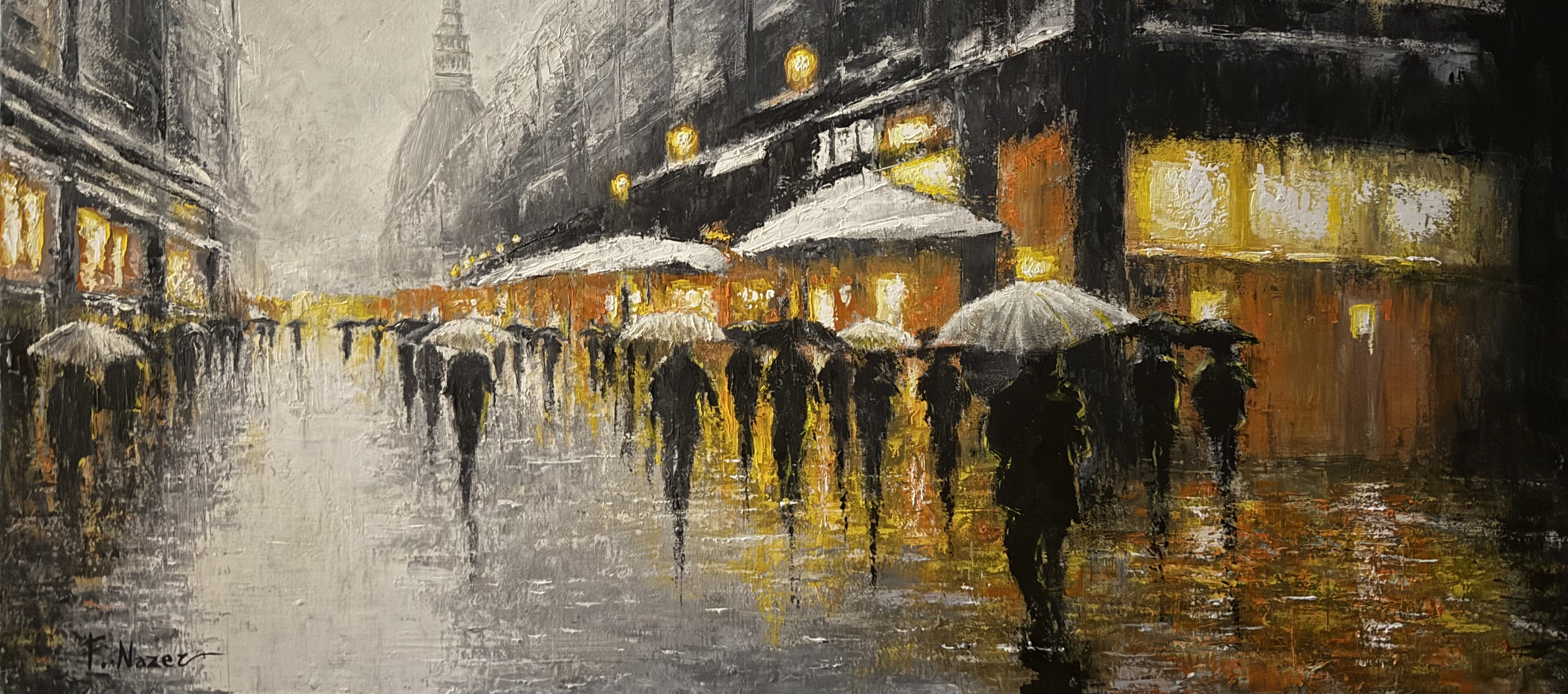 Il talentuoso artista piemontese è senza dubbio uno dei più degni di nota del panorama pittorico emergente contemporaneo; le sue atmosfere metropolitane, i suoi spaccati di vita, non possono non far sentire l’osservatore come parte di un tutto, facendogli ricordare momenti vissuti e solo in apparenza dimenticati. Si forma come autodidatta Fausto Nazer seguendo quell’amore per il disegno grafico che solo in un secondo tempo si estende anche alla pittura, quella più realista, quella in cui l’occhio si sofferma sul conosciuto per poi vagare nel ricordo emotivo. Fin dai primi dipinti, quelli più legati al paesaggio che vive e vede ogni giorno, emerge una spiccata sensibilità attraverso la quale riesce a dar vita e anima a tramonti, nevicate, scorci, che con il suo tocco sembrano muoversi lievemente e dolcemente;